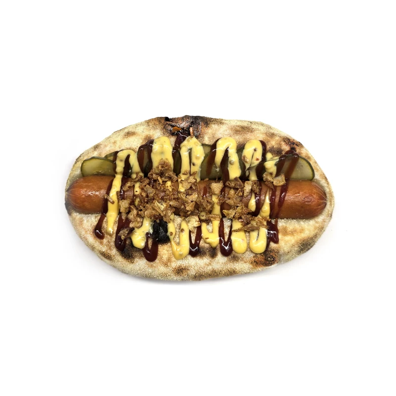 Неаполитанская булка, куриная сосиска, огурцы маринованные, соус барбекю, соус горчичный, лук фри